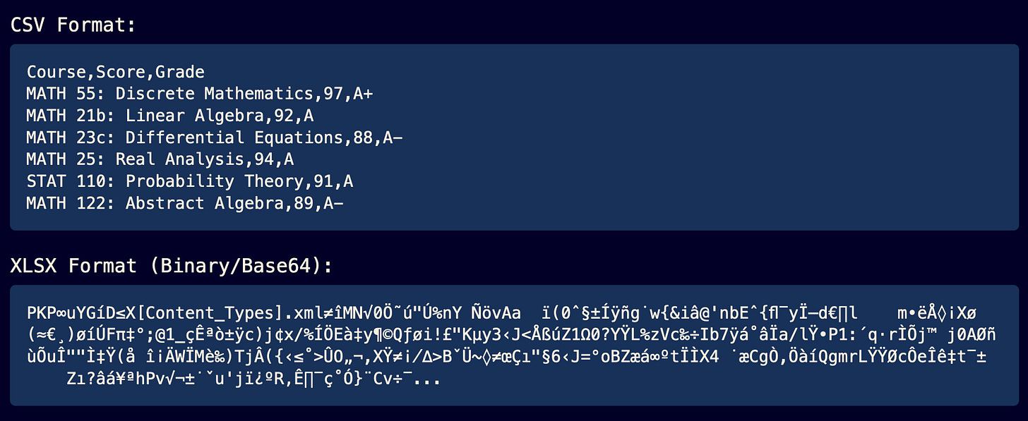 Even if there aren't any destructive edits to our data, one might still feel hard done if it becomes harder to perform those queries on the outputted data than the inputed. Take CSV, or comma-separated values, files. This is a really simple format for storing tabular data, where each row is delineated by a new line and values in adjacent columns separated by a comma. Excel allows you to import a spreadsheet from a CSV. And Excel saves the new spreadsheet as an XLSX file, Microsoft's proprietary format.